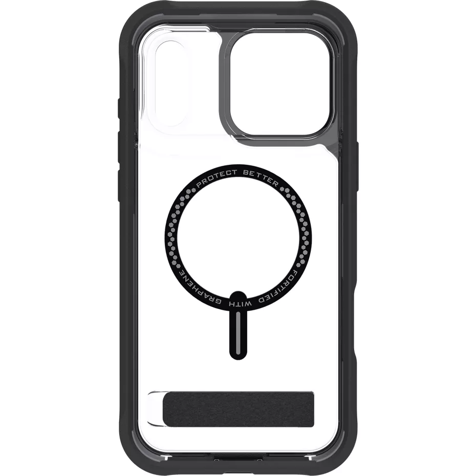 The Rainier Clear Kickstand Case with MagSafe for iPhone 17 Pro Max offers intense case protection. It has been tested and proven to protect your phone from drops up to 22 feet¹. This case is fortified with Graphene, a material harder than diamond, yet more elastic than rubber, and up to 200 times stronger than steel. The Rainier Clear Kickstand Case features a two-piece construction, where the main case plus a frame snap easily into place over your phone for extra protection. This magnetic case is compatible with most wireless chargers and magnetic accessories. An integrated kickstand allows for hands-free viewing and folds back flush with the case. The corner bumpers provide impact absorption and protect the most vulnerable areas of the case. It also includes lanyard holders, making it easy to attach a lanyard. The Rainier Clear Kickstand Case is made in part with up to 80% post-consumer recycled content² and comes with a manufacturer's limited lifetime warranty, providing replacements for wear or damage for the length of your device's life.¹Based on independent testing. Recycled material is certified through a third-party mass balance allocation process. | Zagg Rainier Clear Kickstand Case with MagSafe for iPhone 17 Pro Max - Black | Verizon