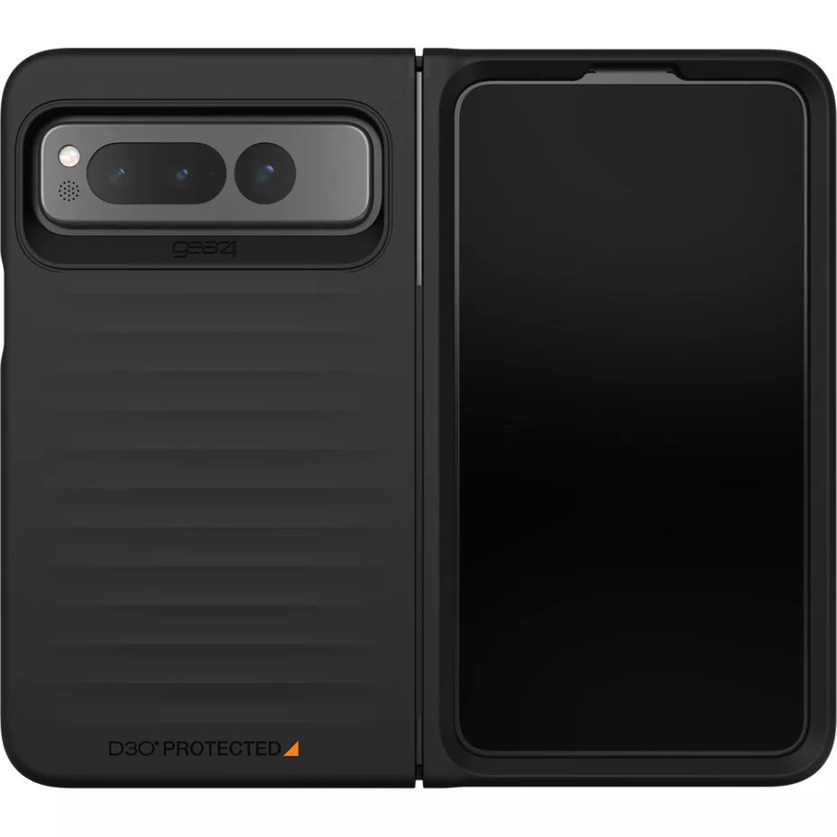 Protect your phone with the Bridgetown Case for Pixel Fold. This sturdy case provides impact and scratch protection for drops up to 10 feet.¹ The hinge design covers and protects the hinge of your device as well as the phone. Built-in antimicrobial treatment protects the case from odor-causing bacteria and germs. And, it's wireless charging compatible so you don't have to remove your case to charge your phone. Made with D3O® Bio. The Bridgetown Case is both sturdy and sustainable. D3O Bio is a plant-based protection material made in part with up to 46% renewable resources. ¹ Based on independent testing. | Gear4 Bridgetown Case for Pixel Fold - Black | Verizon