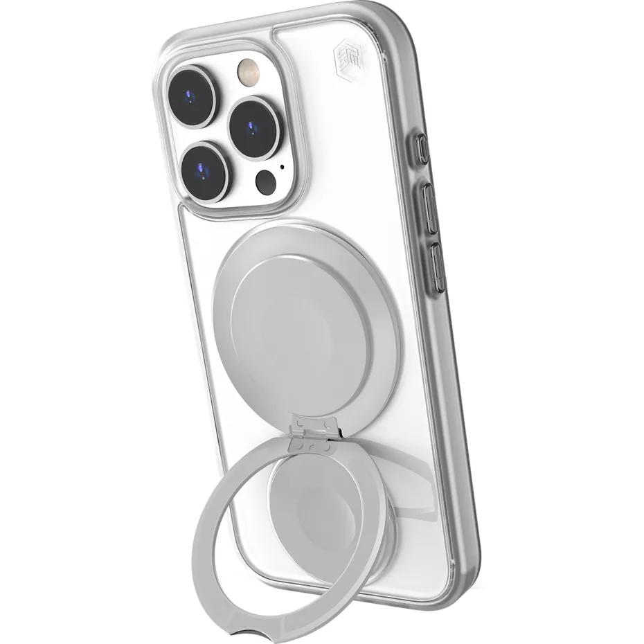 Unwind with a phone case that transforms your device into a source of relaxation. Featuring calming spinning discs, this design offers on-demand stress relief, reminiscent of a fidget spinner. The 360-degree rotating magnetic kickstand allows for versatile viewing angles, making it easy to enjoy videos or video calls hands-free. Crafted from impact-absorbing TPU and high-clarity polycarbonate, this case ensures robust protection against drops. With a strong MagSafe magnet array, your phone stays securely attached to your MagSafe accessories, and the raised bezel shields the lens cluster from impact. Independent buttons guarantee full functionality, blending style with practicality in one essential accessory. | STM Roll Case with MagSafe for iPhone 16 Pro Max - Silver | Verizon