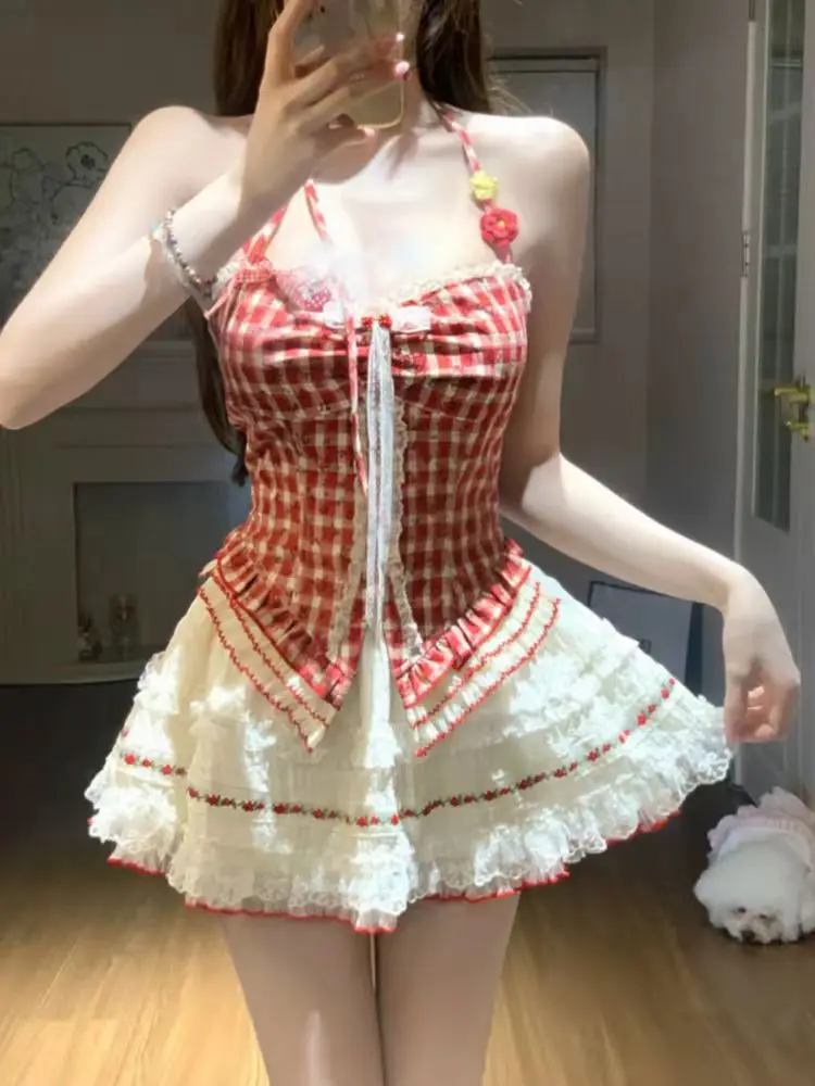Summer Sweet Off Shoulder Sling 2-piece Set Women's Cottagecore Slim Lace Vest Tops Design High-wai…
