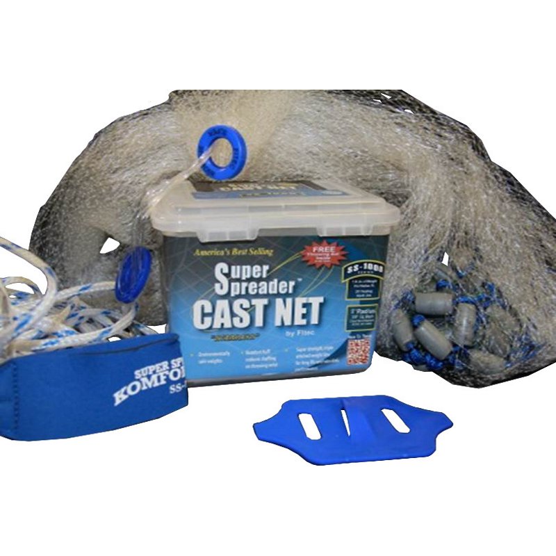 The Fitec SS-1000 Super Spreader⢠7' Cast Net features monofilament resin netting, heavy-duty 90 lb. braille test lines and a floating 26' braided polyethylene hand line. The Komfort Kuff⢠helps reduce chafing on your throwing wrist. Bull's-eye design. Fitec SS-1000 Super Spreader⢠7' Cast Net - Castnets/Trotline And Gaffs at Academy Sports