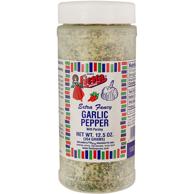 Flavor up your next chicken, beef, fish or vegetable dish with the Bolner Fiesta Brand 12.5 oz Garlic Pepper. The blend of garlic flavor, ground pepper and parsley add a mouth-watering taste, and the clear safety seal helps ensure freshness. Made in USA. Bolner Fiesta Brand 12.5 oz Garlic Pepper - Seasonings at Academy Sports