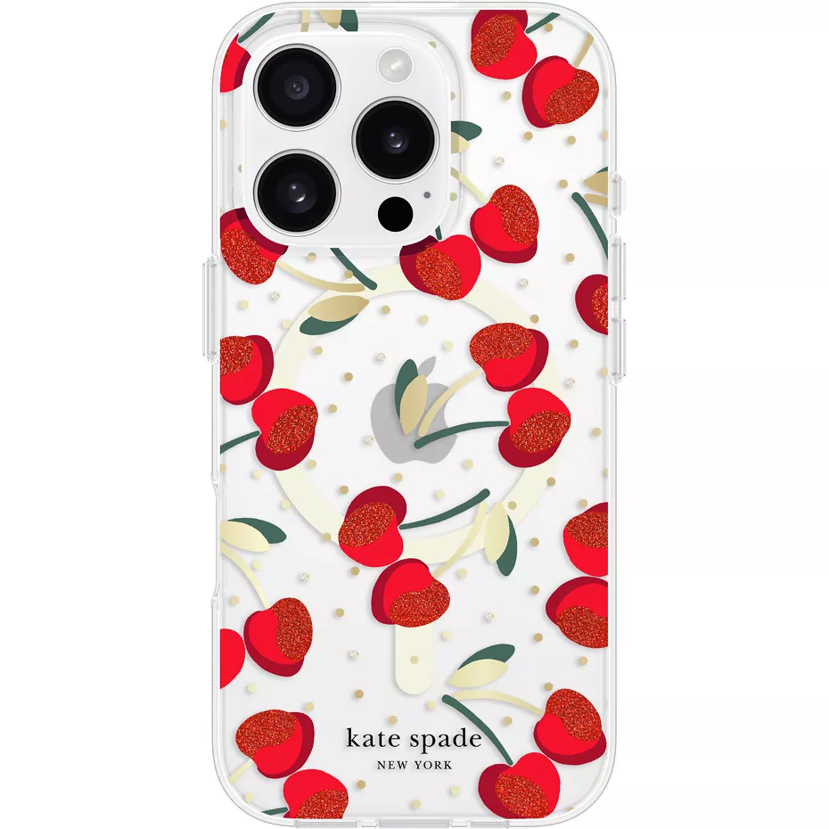 Give your phone a bit of razzle dazzle with the Protective Case with MagSafe for iPhone 16 Pro. Made in part from sustainable materials, this case features reflective glitter, gold accents and crystal embellishments for extra sparkle. Anti-scratch coatings and UV protection help keep your case looking like new. Up to 12 feet of drop protection shields against drops, bumps and dings.¹ And, with strong built-in magnets for MagSafe, you can charge your phone without removing your case. ¹ Based on independent testing. | Kate Spade Protective Case with MagSafe for iPhone 16 Pro - Cherry Dot | Verizon