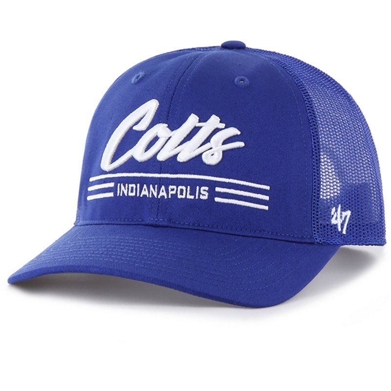The '47 Trucker RF (relaxed fit) is an unstructured version of our popular trucker style, has a comfortable mid-crown, a curved visor, and an adjustable plastic snapback. The front has a raised embroidery logo with woven label on the back. Made from garment washed cotton twill and mesh. '47 Men's Colts Garner Trucker Rf Cap Blue - NFL Caps at Academy Sports