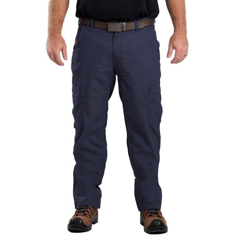 Stay safe on the job with Berne Men's Flame Resistant Ripstop Cargo Pants. The cotton blend ripstop fabric is flame resistant, and the button front and brass fly resist electricity arcing. Triple-stitched seams and reinforced hems provide extra durability. The relaxed fit and articulated knees let you move naturally. Berne Men's Flame Resistant Ripstop Cargo Pants Navy Blue, 48" - Men's Work Bottoms at Academy Sports