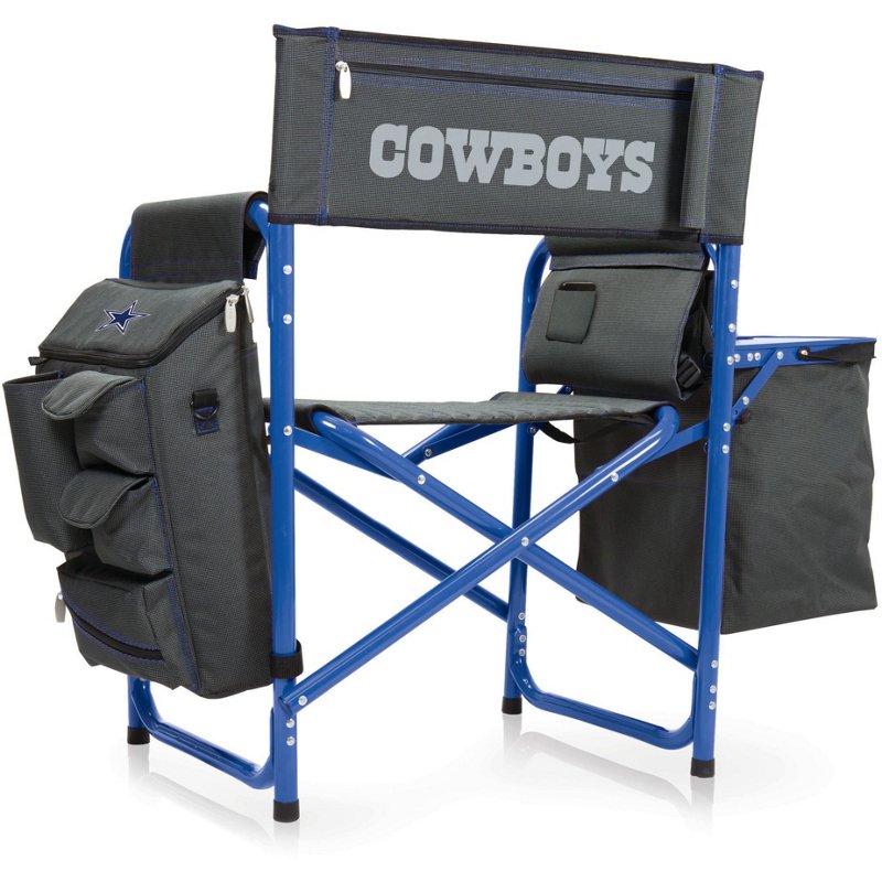 Show up prepared for your next tailgate with the Picnic Time Dallas Cowboys All-in-One Fusion Camping Chair. Its padded seat and backrest keep you comfortable and are emblazoned with your team's logo. The cell phone pocket and accordion shelves offer ample storage for all your game day gear, and the folding side tray with cupholder lets you snack and sip with ease. When the party's over, the folding design and padded backpack straps enable convenient carry. Picnic Time Dallas Cowboys All-in-One Fusion Camping Chair Dark Grey/Blue - Pro Licensed Novelty at Academy Sports