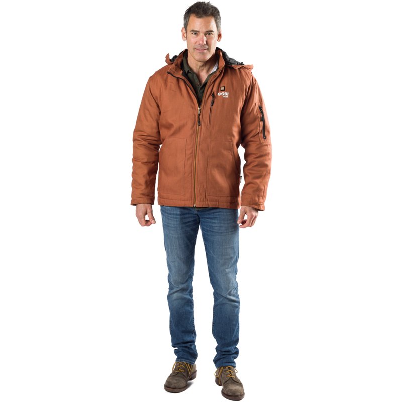 Do tough jobs in rough weather with the Gobi Heat Men's Grit 5-Zone Heated Jacket. The sturdy cotton duck shell is wind and water-resistant, and the nylon liner is easy to clean. Active warmth comes from 5 battery-powered heating zones in strategic areas. Temperature is customizable with 3 settings. Gobi Heat Men's Grit 5-Zone Heated Jacket Camel, X-Large - Men's Thermals at Academy Sports