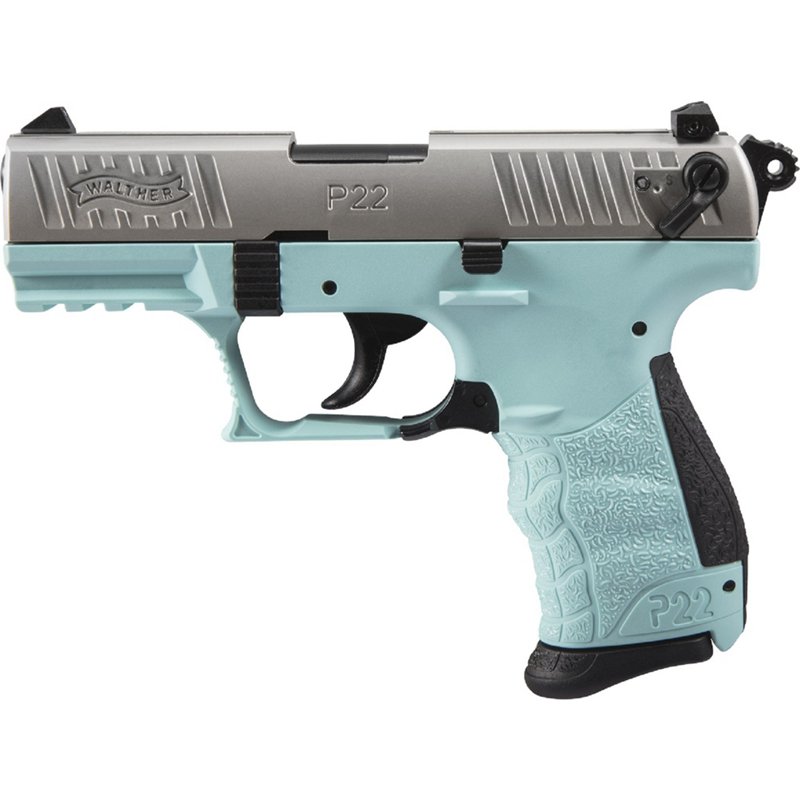 The Walther Arms P22 Q Angel Blue .22 LR Pistol with a nickel finish features a 3.42-inch threaded polymer barrel and an 11-pound single-action/double-action trigger. This rimfire pistol with a 10-round capacity has a windage-adjustable rear sight and an ambidextrous magazine release. Includes a manual and auto slide safety system and captured recoil spring. Walther Arms P22 Q Angel Blue .22 LR Pistol - Handgun Semiauto Rmfire at Academy Sports