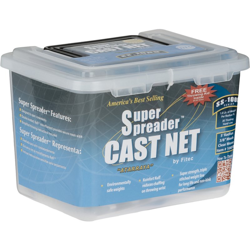 The Fitec SS-1000 Super Spreader⢠5' Cast Net features monofilament resin netting, heavy-duty 90 lb. braille test lines and a floating 26' braided polyethylene hand line. The Komfort Kuff⢠helps reduce chafing on your throwing wrist. Bull's-eye design. Fitec SS-1000 Super Spreader⢠5' Cast Net - Castnets/Trotline And Gaffs at Academy Sports