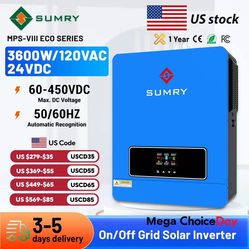 Sumry 3.6kw Hybrid Solar Inverter 110/120v 24v Dual Output with MPPT 120A 60-450v 50/60hz Home Inve…