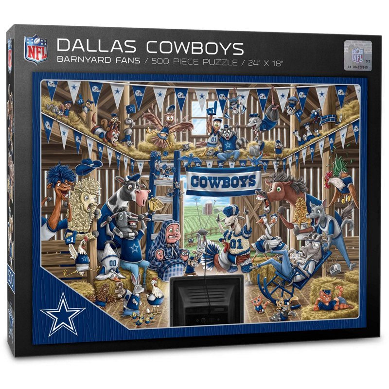 Have some barnyard fun and support the Cowboys when you put together the YouTheFan Dallas Cowboys Barnyard Fans 500-Piece Puzzle. This puzzle has a barnyard design with all of the animals cheering and watching your team play to express your fandom in a unique way. This puzzle measures 18 inches x 24 inches when completed. YouTheFan Dallas Cowboys Barnyard Fans 500-Piece Puzzle Navy Blue - Pro Licensed Novelty at Academy Sports