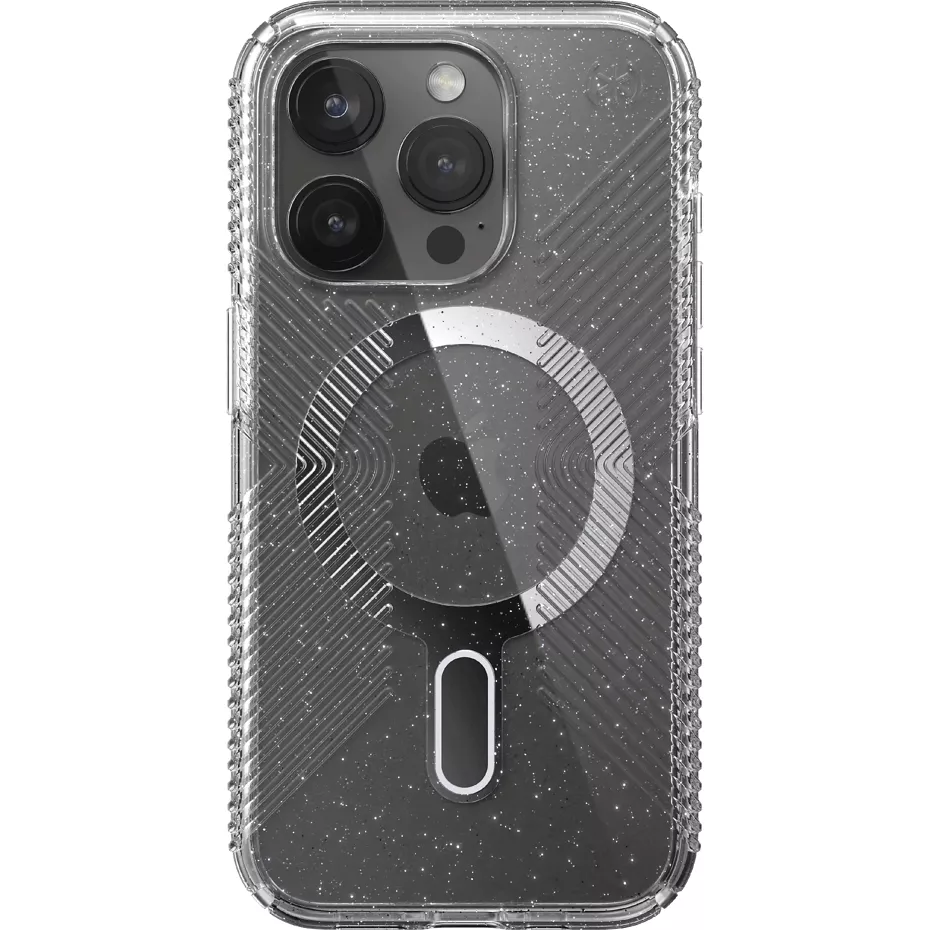 Add a bit of sparkle to your phone with the Presidio Lux Grip Glitter Case with MagSafe for iPhone 15 Pro. Made in part from up to 50% recycled materials, this clear case features a iridescent glitter design that doesn't flake or fade and is scratch resistant. Inverted no-slip grips help you keep hold of your phone. Clear Impact technology and raised-bezel screen protection shields against drops up to 13 feet.¹ The ClickLock MagSafe enhancer allows for ClickLock technology to lock your MagSafe accessories into place with a satisfying click. And, it's both MagSafe compatible, so you don't have to remove your case to charge your phone. Antimicrobial protection. Keep your case free of dirt and germs. Microban antimicrobial protection reduces bacteria growth by up to 99%. ¹ Based on independent testing. | Speck Presidio Lux Grip Glitter Case with MagSafe for iPhone 15 Pro - Clear | Verizon