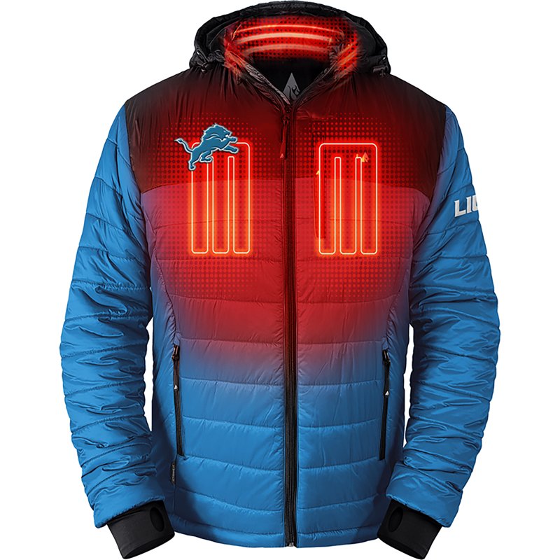 Stay warm while cheering on your favorite team with the ActionHeat Men's Detroit Lions 5V Puffer Heated Jacket. The insulated design and battery-powered heating system help you remain comfortable in chilly conditions, while the team graphic lets everyone know who you support on game day. ActionHeat Men's Detroit Lions 5V Puffer Heated Jacket Blue Black, Small - NFL Adult Outerwear at Academy Sports