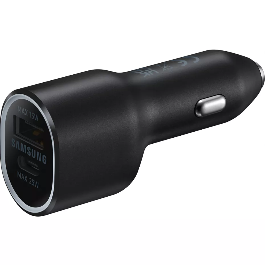 Keep your devices fully charged while on the go with the 40W Car Charger Duo. This dual car charger features a USB Type-C and USB Type-A charging port so that you can charge up to 2 devices simultaneously. The USB-C port provides up to 25W of charging power¹ and is compatible with Super-Fast Charging.² And, with up to 15W of charging power for the USB-A charger, your devices will charge efficiently. ¹ Power output depends on capacity of device being charged; if the device has a lower charging capacity then the power output will adjust down. ² Super-Fast Charging (SFC) supported with Galaxy smartphones with 25W charging capacity or above and other SFC capable devices such as iPhone 8 or higher. SFC only capable with the C-type port of the charger. | Samsung 40W Car Charger Duo - Black | Verizon