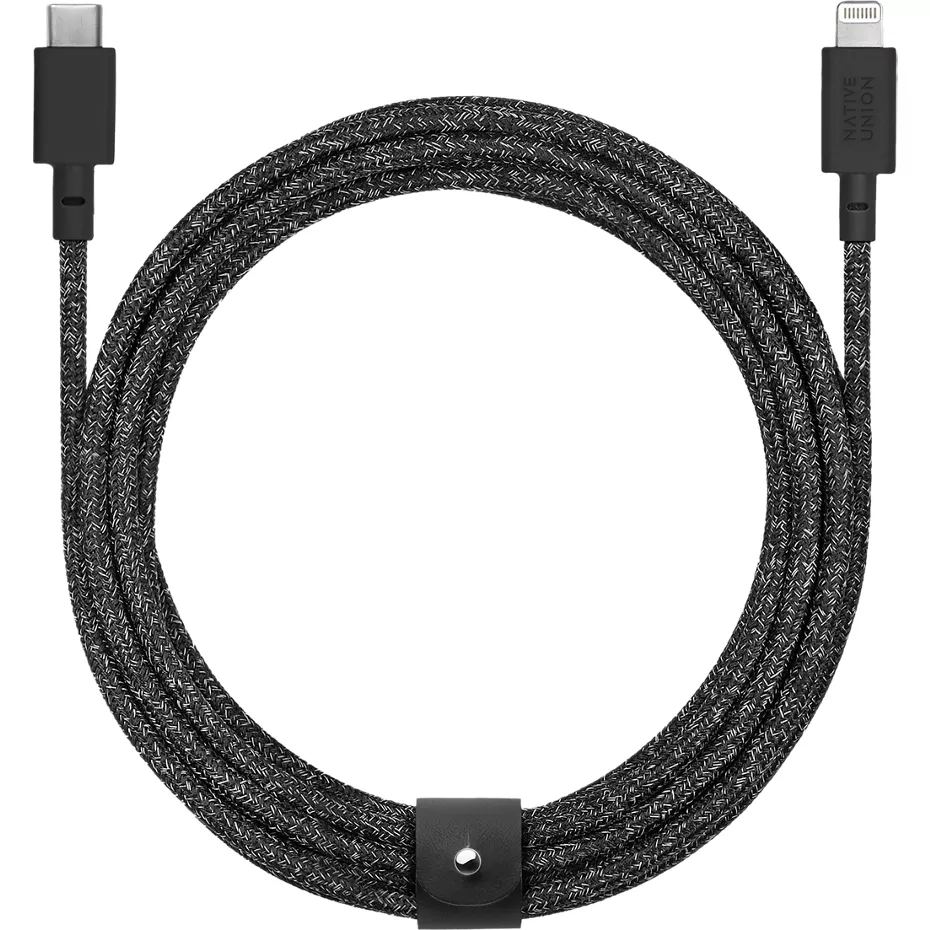 Keep your devices fully charged with the Belt Cable XL,10ft - USB-C to Lightning. This USB-IF and MFi certified cable is crafted with nylon braiding, reinforced to withstand everyday wear and tear. The extra-long 10-foot length allows you to wander while staying connected. And, the tangle-free design features an attached leather belt to help you stay organized. | Native Union Belt Cable XL,10ft - USB-C to Lightning - Cosmos | Verizon