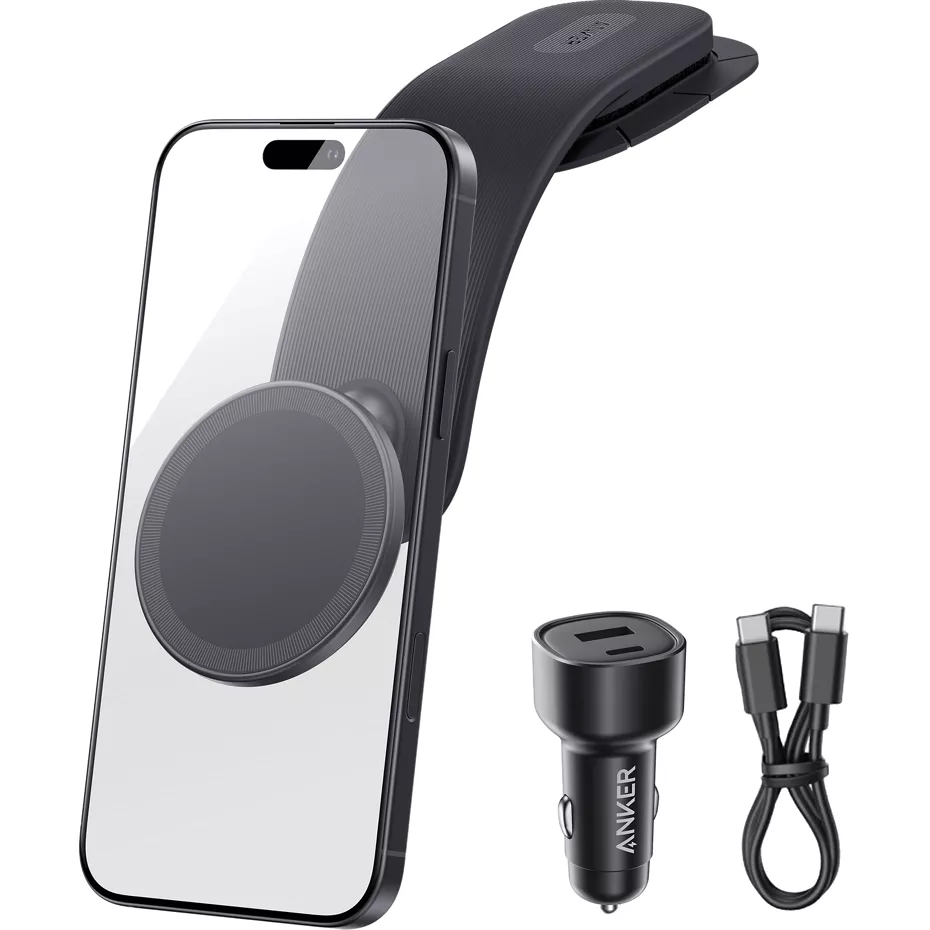 The Nano Wireless Charging Car Mount with Qi2 Magnetic Detachable Pad is an all-in-one car charging kit designed for convenience, stability, and fast power on the go. This complete in-car charging solution includes a flexible memory alloy phone holder, a powerful 30W fast car charger, and a 1-meter USB-C to USB-C cable. The mount's upgraded memory alloy bracket can be bent to any angle, allowing for unlimited installation positions. It secures firmly to your dashboard using a special base glue with a large contact area, ensuring it fits closely without falling off. Find the ideal viewing position instantly with the 360 degrees universal ball head. The MagSafe-compatible mount features a super-strong N52 magnet for a rock-steady hold and a magnetic suction head for a one-second connection, eliminating the need for complicated adjustments. The included 30W fast car charger has both USB-C and USB-A ports to keep multiple devices charged at full speed, and the kit comes with a magnetic ring accessory pack for the charging cable. Fully compatible with both iPhones and Android devices, this kit keeps you safely and efficiently connected while navigating, streaming, or taking calls. | Anker Nano Wireless Charging Car Mount with Qi2 Magnetic Detachable Pad - Black | Verizon