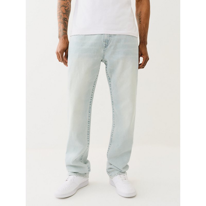 Look your best when you wear the True Religion Men's Ricky Straight Big T Flap Denim Jeans. It is made of 98% cotton and 2% spandex. The Big T stitching and horseshoe detailing on the back flap pockets add a unique touch, and its light denim wash offers versatile styling. The belt loops allow for adjustability. True Religion Men's Ricky Straight Big T Flap Denim Jeans Dover Light Wash, 34" - Men's Casual Jeans at Academy Sports