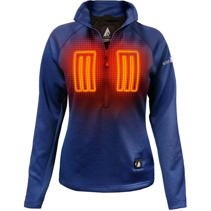 Plug in and get warm with the ActionHeat Women's Slim Fit 5V Battery Heated 1/2 Zip Pullover. The lightweight stretch material moves with your body for an unrestrictive fit. Battery-powered infrared panels are strategically placed to deliver active warming around your core, keeping you warm in the coldest conditions. The discrete battery bank provides consistent power and can also charge your electronic devices. ActionHeat Women's Slim Fit 5V Battery Heated 1/2 Zip Pullover Heather Blue, Large - Women's Ski Outerwear at Academy Sports