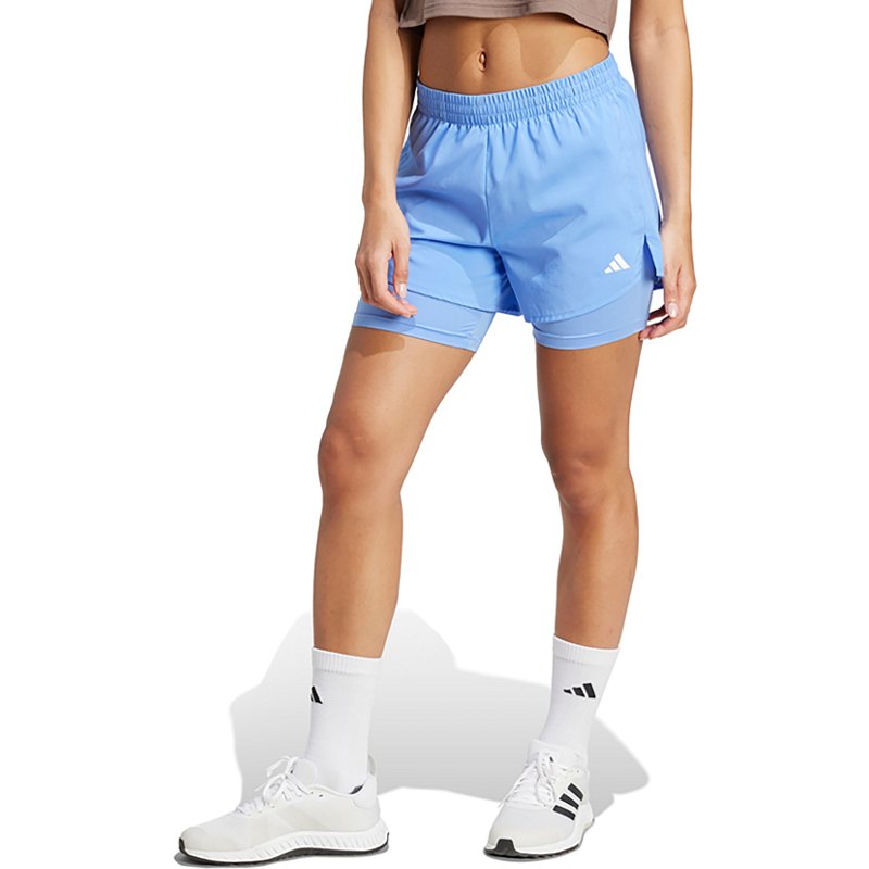 Look your best while breaking a sweat in the adidas Women's Mini 2 in 1 Shorts 3 in. These shorts are made of 100% recycled polyester with Aeroready technology that absorbs moisture to make you feel dry and ready to perform, and the built-in tights are moisture-wicking. The seam placements and cut lines give you the comfort to move freely without any distraction. adidas Women's Mini 2 in 1 Shorts 3 in Blue Fusion/White, X-Small - Women's Athletic Performance Bottoms at Academy Sports