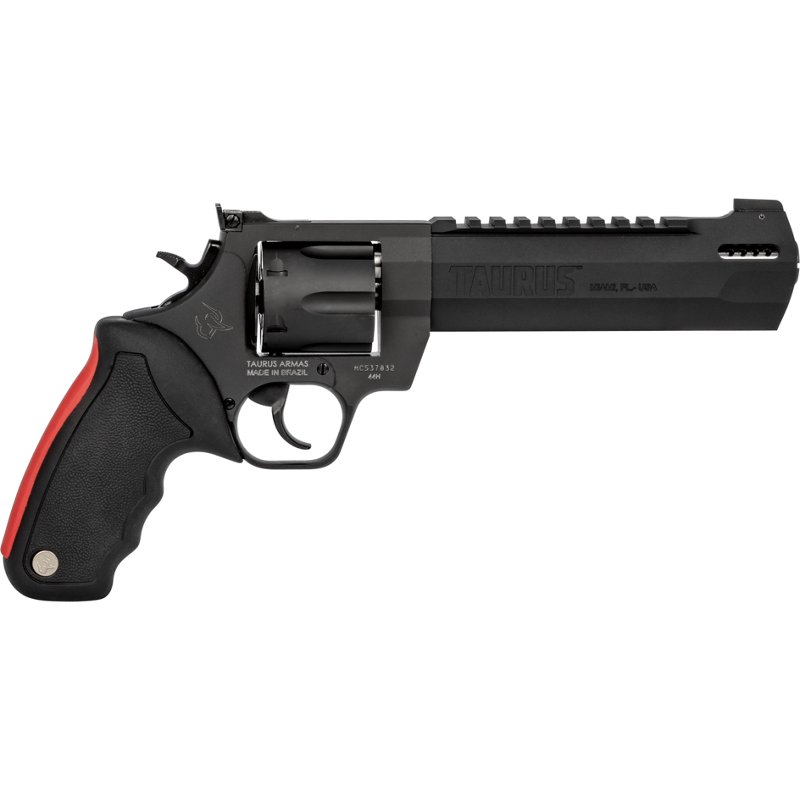 The Taurus Raging Hunter .44 Remington Magnum Revolver is single/double action and has a 6-round capacity. It's built with a ported barrel with Picatinny rail, a steel frame and a thumb safety. Fixed front and adjustable rear sights and a rubber grip with integrated cushion insert complete the design. Taurus Raging Hunter .44 Remington Magnum Revolver - Handgun Rvolvr/Single Centre at Academy Sports