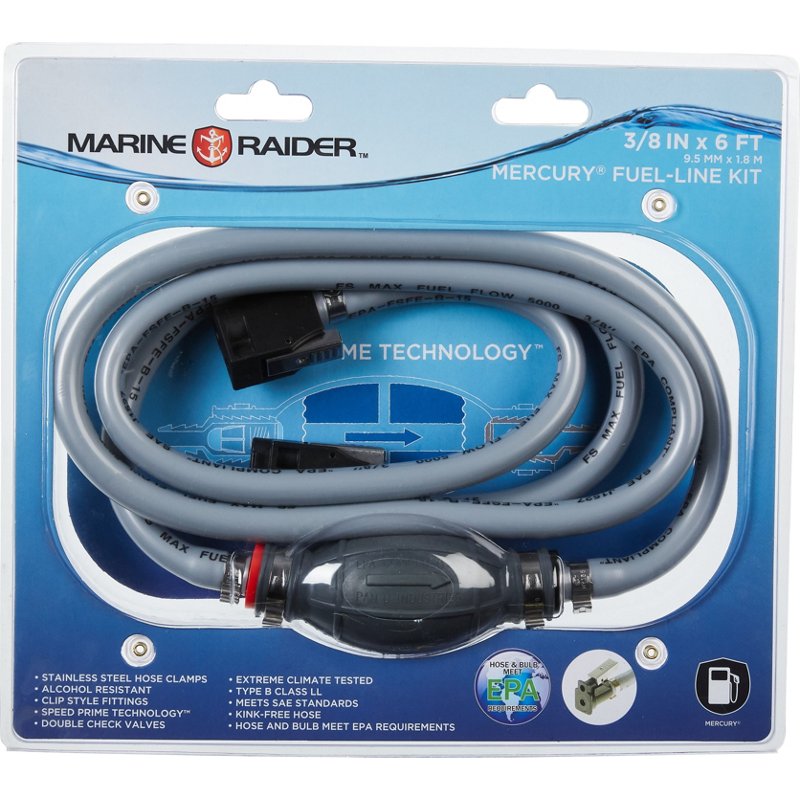 Time to replace your fuel hose? The Marine Raider 3/8 in x 6 ft Mercury Fuel Line is a durable, environmentally friendly solution for repairing your newer style Mercury outboard. This fuel hose features a kink-free design, alcohol resistance and stainless-steel hose clamps. Plus, the Speed Prime Technology⢠helps deliver a quick prime when it's time to get out on the water. Marine Raider 3/8 in x 6 ft Mercury Fuel Line - Motor And Fuel Acces at Academy Sports