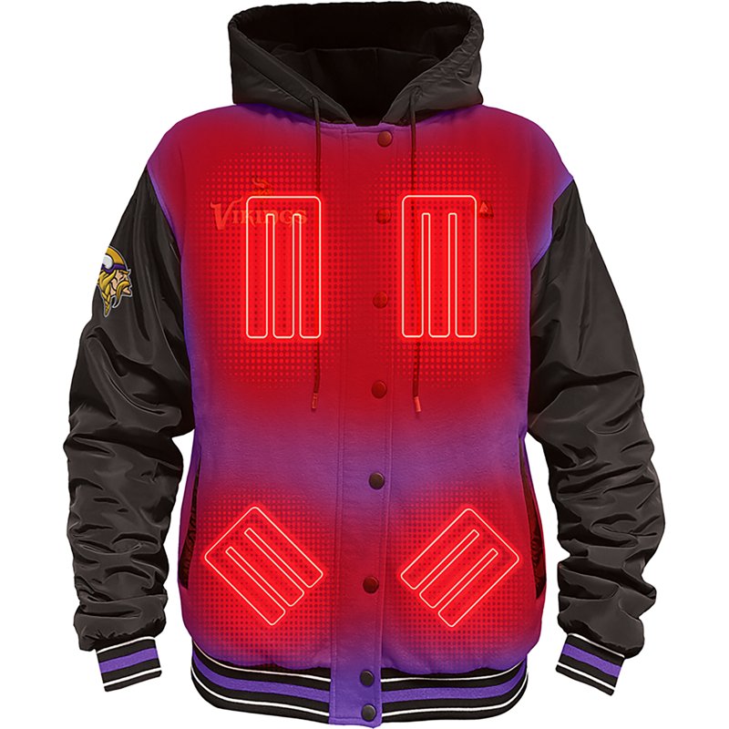 Stay warm while cheering on your favorite team with the ActionHeat Men's Minnesota Vikings 5V Heated Varsity Jacket. The insulated design and battery-powered heating system help you remain comfortable in chilly conditions, while the team graphic lets everyone know who you support on game day. ActionHeat Men's Minnesota Vikings 5V Heated Varsity Jacket Purple Black, Medium - NFL Adult Outerwear at Academy Sports