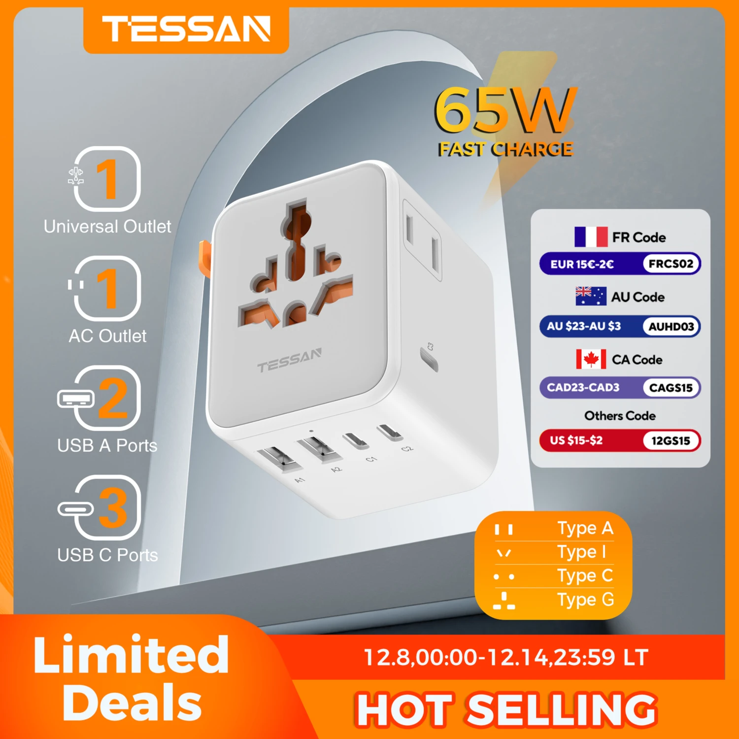 TESSAN 65W GaN Universal International Plug Adapter with Multifunctional AC Outlet USB Type C Trave…