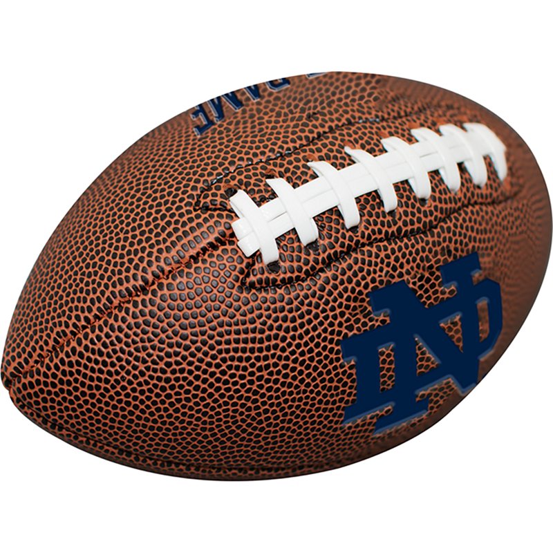 Root for your favorite team when you use the Logo Brands Notre Dame Fighting Irish Mini Size Composite Football. Its composite leather with a pebble grain texture resists wear and team. The synthetic sewn laces help with your aiming accuracy, and its small size is perfect for little hands. The debossed Notre Dame Fighting Irish details and team-color stripes show off your team spirit. Logo Brands Notre Dame Fighting Irish Mini Size Composite Football Brown - NCAA Novelty at Academy Sports