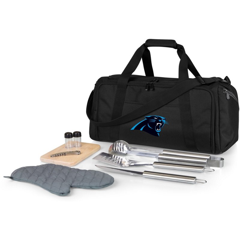 Show off your fan pride while grilling up your favorite food with the Picnic Time Carolina Panthers BBQ Grill Set and Cooler Kit. The cooler has a heat-sealed interior liner to keep food and drinks at the optimal temperature, and the included 8-piece stainless-steel grill set makes food preparation a breeze. The multiple pockets hold all your essentials, and the carry handles and shoulder strap promote simple transport. Picnic Time Carolina Panthers BBQ Grill Set and Cooler Kit - Pro Licensed Novelty at Academy Sports