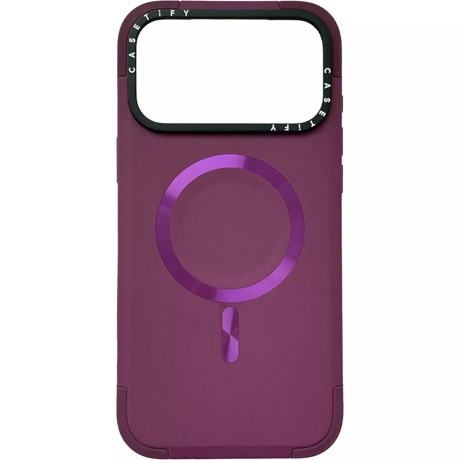 The Force Case with MagSafe for iPhone 17 Pro features a robust, rugged design that offers impressive up to 6.6 feet drop protection¹, ensuring your device stays safe from everyday mishaps. With an external MagSafe ring and compatibility with MagSafe accessories, charging is a breeze. Enjoy all-around protection with shock-absorbing corners, a rigid backplate, and an ergonomic grip that feels great in your hand while remaining pocket-friendly. Complete with a lifted camera ring and fully rounded bezel for screen protection, this case keeps your phone secure and stylish. Plus, the convenient strap hole lets you add your favorite phone charm for a personalized touch. Embrace sustainability by recycling your old case through our Re/CASETiFY™ initiative, joining over 2 million others in giving new life to materials. | Casetify Force Case MagSafe for iPhone 17 Pro - Mulberry | Verizon