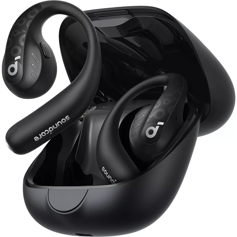 Listen to your favorite playlist on the go with AeroFit Pro Open Ear Bluetooth Headphones. These open-ear wireless earbuds with LDAC technology and 16.2mm oversized diaphragms create a robust resonant sound. Spatial audio immerses you in your favorite tunes for a high quality listening experience. 4 beamforming microphones with dedicated algorithms help maintain crystal clear calls. The IPX5 water resistant design with SweatGuard is designed to stand up to your toughest workout.¹ And, the detachable neckband makes it easy to keep track of your earbuds. Long-lasting battery. The earbuds hold up to 14 hours of playtime on a single charge, that's extended to up to 46 hours with the charging case.² And, a quick 10-minute charge delivers up to 5.5 hours of listening.² ¹ IPX5: Can resist a sustained, low-pressure water jet spray. ² Battery life and charge cycles vary with use, settings, and other factors; actual results will vary. | Anker AeroFit Pro Open Ear Bluetooth Headphones - Black | Verizon