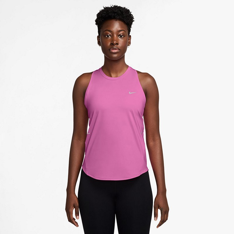 Give it your all in the Nike Women's Swift Dri-FIT Running Tank Top. The polyester and spandex material provides a comfortable feel, while the Dri-FIT technology wicks away sweat to keep you cool and dry. The curved hem offers coverage, and the reflective graphics promote visibility. Nike Women's Swift Dri-FIT Running Tank Top Playful Pink/(Reflective Silv), Large - Women's Running Tops at Academy Sports