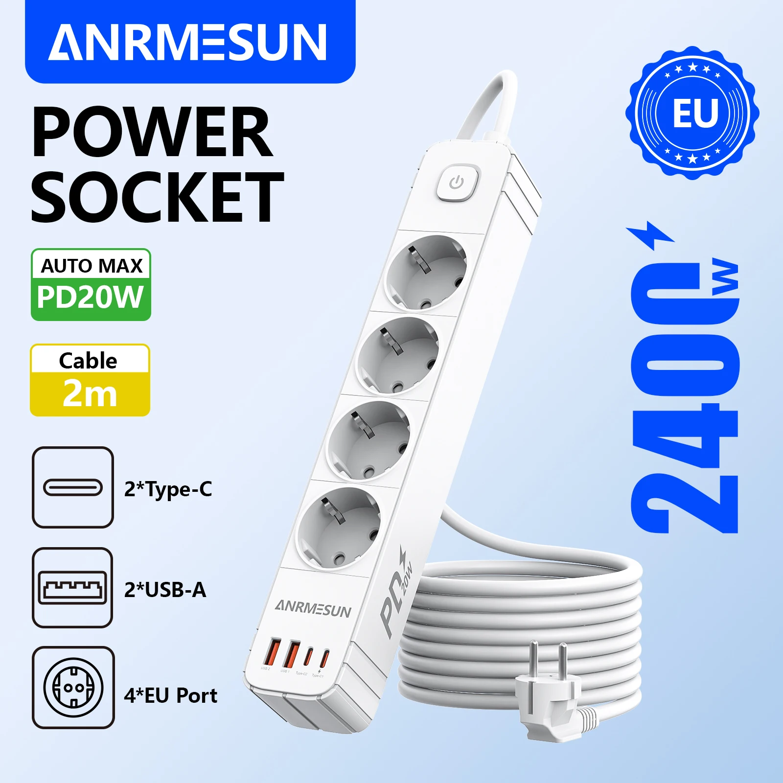 ANRMESUN Power Strip Surge Protector With 4 AC And 2 Type C Port EU Electrical Outlet Socket Adapte…