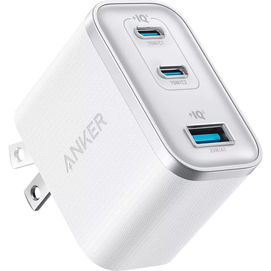 The Nano 70W 3-Port GaN Wall Charger is a compact yet powerful 70W GaN charger that serves as your ultimate charging companion. It can power up a laptop (up to 65W) while simultaneously charging a phone or tablet. The charger offers versatile power combinations like 65W+5W, allowing you to charge a 65W laptop and a low-power device simultaneously, and a new 45W+25W power combination to support Samsung's 45W and 25W fast charging. With its innovative four-port design, you can wake up to fully charged phones, tablets, and even your watch, all at once. The charger is compact and portable and a space-saving, low-profile design that stays securely plugged in without wobbling. Thanks to advanced GaN tech and cooling innovation, it charges faster and stays cooler than standard chargers. An exclusive structural invention patent effectively controls the temperature, preventing overheating and ensuring cooler and safer charging. | Anker Nano 70W 3-Port GaN Wall Charger - White | Verizon
