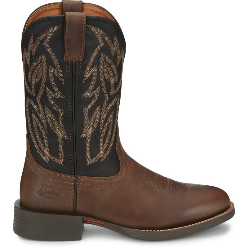 Stay supported all day wearing the Justin Boots Men's Stampede Rendom Western Boots. These western boots feature upgraded cowhide leather uppers for rugged durability and removable orthotic comfort insoles for cushioning. The oil- and slip-resistant outsoles provide sturdy traction on wet surfaces. Justin Boots Men's Stampede Rendom Western Boots Brown/Black, 11 - Men's Ropers at Academy Sports
