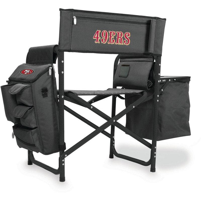 Show up prepared for your next tailgate with the Picnic Time San Francisco 49ers All-in-One Fusion Camping Chair. Its padded seat and backrest keep you comfortable and are emblazoned with your team's logo. The cell phone pocket and accordion shelves offer ample storage for all your game day gear, and the folding side tray with cupholder lets you snack and sip with ease. When the party's over, the folding design and padded backpack straps enable convenient carry. Picnic Time San Francisco 49ers All-in-One Fusion Camping Chair Dark Grey/Black - Pro Licensed Novelty at Academy Sports