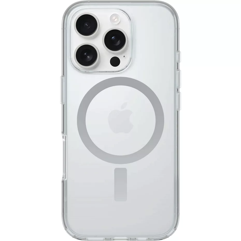 Shield your phone from drops, bumps and dings with the Symmetry Series Clear Case for iPhone 16 Pro. Made in part with up to 40% recycled plastic, this ultra-slim, clear case makes it easy to show off your device. The rigid design and reinforced corners for added shock absorption. The raised edges protect your screen and camera from cracking and shattering. Built-in anchors make it easy to connect phone straps and charms. Tactile buttons feel just like your phone's and don't impede the use of your phone. And, built-in magnets snap securely into MagSafe chargers and accessories so you don't have to remove your case. OtterBox tough. OtterBox puts their cases through rigorous testing. OtterBox Certified Drop+ Protection is backed by 24+ tests and 238+ hours of testing so you know you are getting a tough-as-nails case.¹ ¹ Based on independent testing. | OtterBox Symmetry Series Clear Case for iPhone 16 Pro - Clear | Verizon