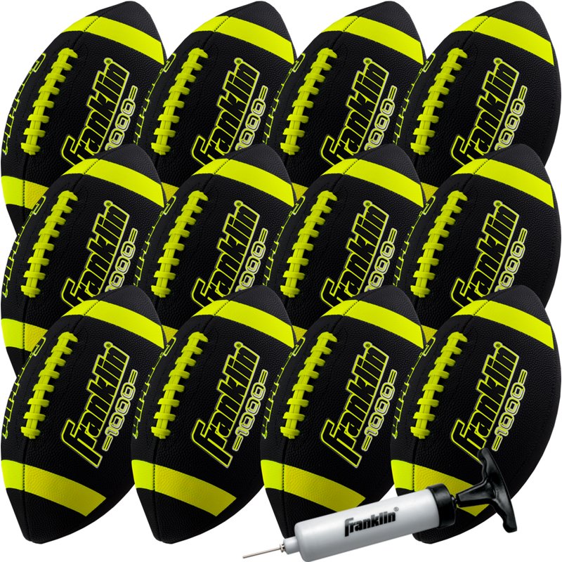 Practice is the name of the game with the Franklin Grip-Rite 1000 Junior Youth Outdoor Footballs 12-Pack. Featuring a durable, synthetic leather cover, these footballs are equipped with a high-grip, deep-pebble cover design for traction and easy throwing. The footballs also come with official Junior sizing and pro-style, hand-sewn laces for convenience. Franklin Grip-Rite 1000 Junior Youth Outdoor Footballs 12-Pack Black - Outdoor Games at Academy Sports