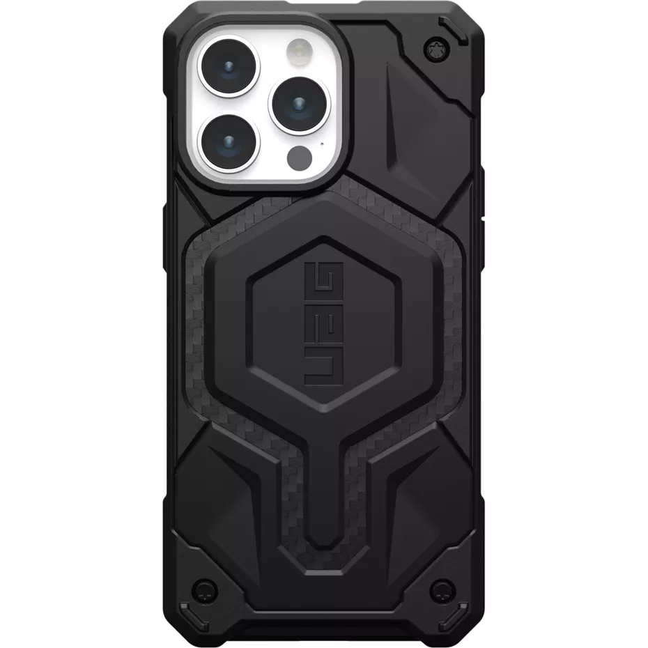 Only at Verizon. Protect your phone from drops, bumps and dings with the Monarch Pro Case with MagSafe for iPhone 15 Pro Max. The premium carbon-fiber case and protective screen surround creates 5 layers of device protection that shields for drops up to 25 feet.¹ And, with the built-in MagSafe module, it's compatible with MagSafe chargers and accessories. ¹ Based on independent testing. | UAG Monarch Pro Case with MagSafe for iPhone 15 Pro Max - Carbon Fiber | Verizon
