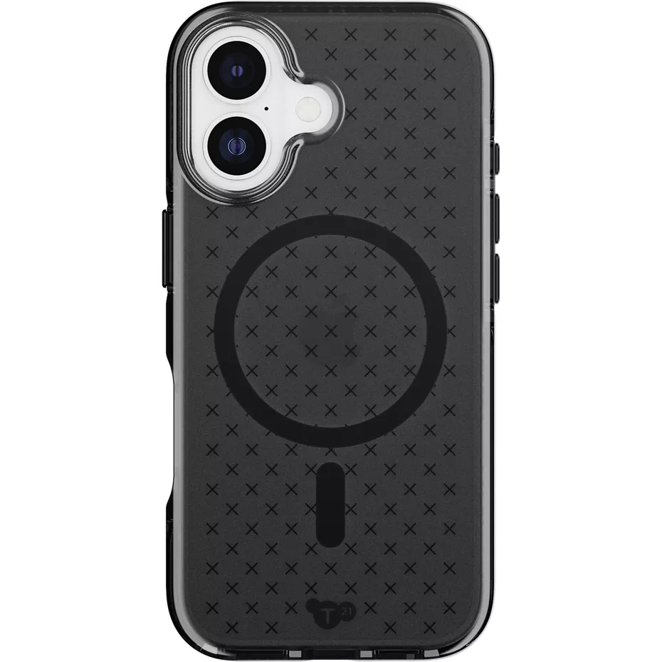 The EvoCheck Case with MagSafe for iPhone 17 offers robust protection and innovative features to enhance your phone's durability and user experience. Featuring FlexShock™ protection, this case provides up to 16 feet of drop protection¹ by absorbing impact and reforming its structure using heat energy. Designed with sustainability in mind, this case incorporates Bio-Spice™, an innovative additive that helps break down the case's plastic materials (excluding magnets) in anaerobic environments like landfills once you're finished with it². Experience the satisfying click of our interchangeable mechanical buttons. The self-healing material properties keep your case scuff and scratch-free, maintaining its pristine look. This bestselling case sports a signature, iconic yet subtle check design. Additionally, it includes enhanced camera protection with raised bevelling specifically designed to safeguard your camera lenses.¹Based on independent testing.²Bio-Spice™ is an additive designed to boost microbial activity in oxygen-free environments, helping break down the plastic casing (but not the magnets). It has been tested under ASTM D5511 conditions. Not certified as compostable or recyclable. | Tech21 EvoCheck Case with MagSafe for iPhone 17 - Smokey Black | Verizon