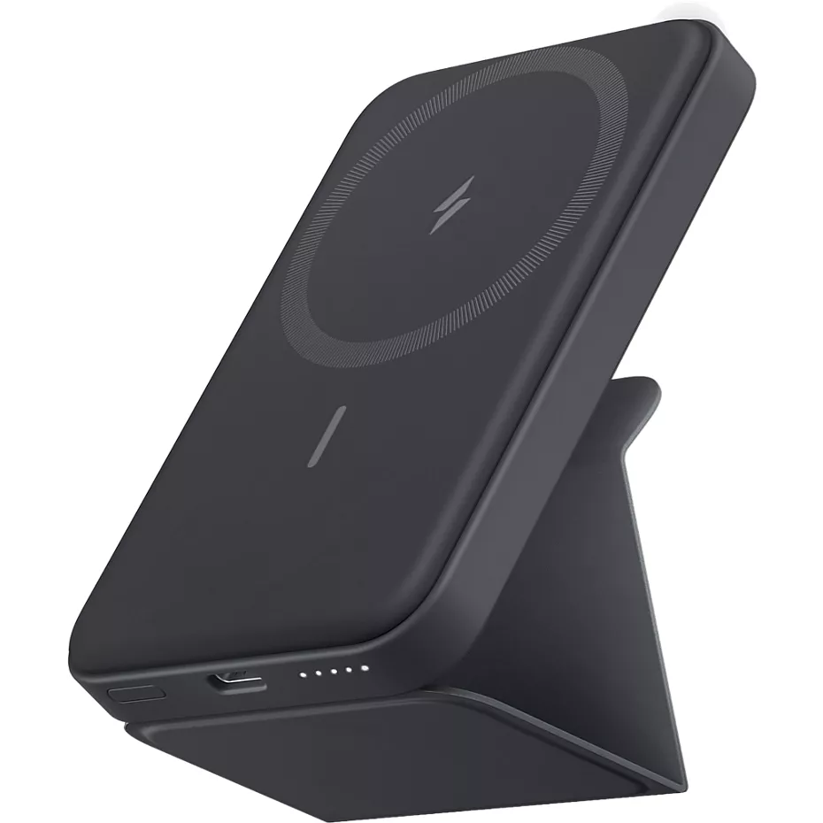 Keep your MagSafe phone charged while on the go with the PowerCore MagGo 5K. This slim and compact portable charging stand features a versatile, built-in foldable kickstand that keeps your phone upright, at a comfortable viewing angle. Super strong magnet snaps your phone into place to ensure perfect alignment. The 5,000 mAh battery provides up to 17 hours of battery life.¹ And the 2-way USB-C charging port allows you to either recharge the portable charger or charge a second USB-C device. MultiProtect technology. With advanced safety features like temperature control, overload protection and more, MultiProtect technology helps you charge without worry. ¹Battery life and charge cycles vary with use, settings, and other factors; actual results will vary. | Anker PowerCore MagGo 5K Portable MagSafe Charger - Black | Verizon
