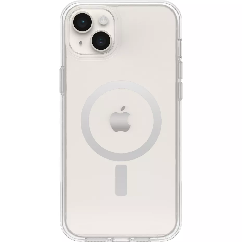 Shield your phone from drops, bumps and dings with the Symmetry Series+ Case with MagSafe for iPhone 14 Plus. Designed to work with MagSafe devices for seamless wireless charging, this ultra-slim, 1-piece case makes it easy to keep your phone fully charged. The raised edges protect your screen and camera from cracking and shattering. The eco-friendly case is made with up to 50% recycled plastic. And, the form-fitting design protects your phone while still providing full access to your buttons, switches, ports and speakers. Antimicrobial protection. Infused with a silver-based additive that continually blocks microbial growth, this lasting antimicrobial technology helps protect your case against many common bacteria.¹ OtterBox tough. OtterBox puts their cases through rigorous testing. OtterBox Certified Drop+ Protection is backed by 24+ tests and 238+ hours of testing so you know you are getting a tough-as-nails case.² ¹ It does not protect you or the screen. ² Based on independent testing. | OtterBox Symmetry Series+ Case with MagSafe for iPhone 14 Plus - Clear | Verizon