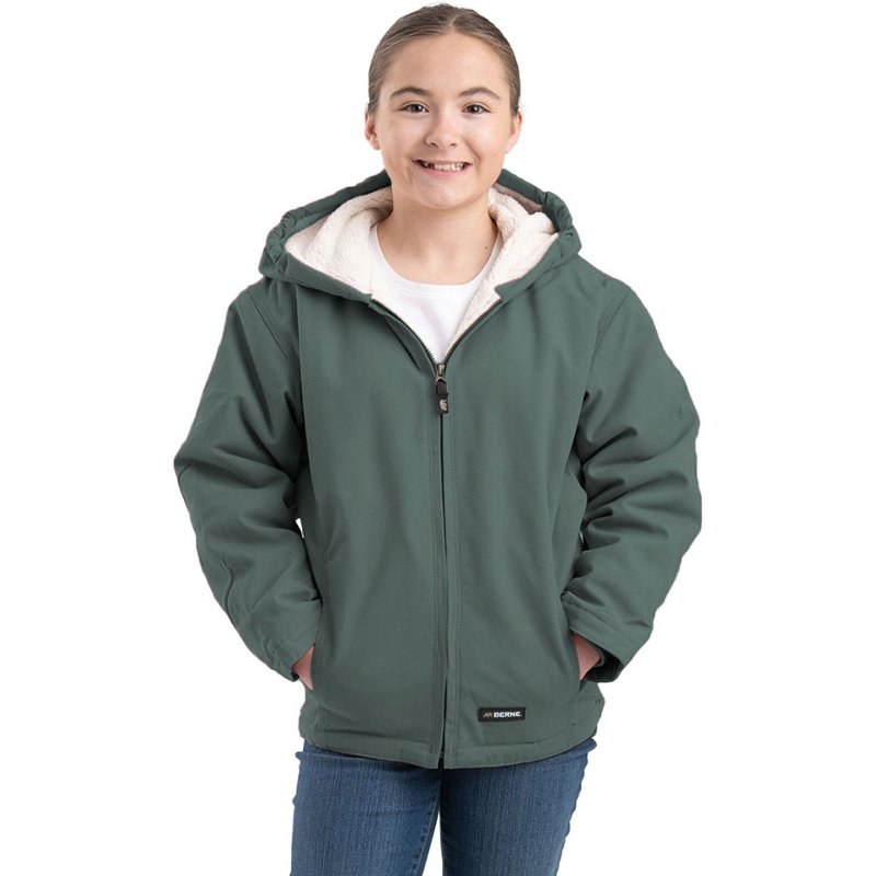 Keep warm this winter in the Berne Girls' Sherpa-Lined Softstone Duck Hooded Jacket. The tough duck shell is lined with Sherpa for softness, and the rib knit storm cuffs and extended back hold in heat. Plenty of pockets provide storage for your essentials, and princess seams create a flattering look. Berne Girls' Sherpa-Lined Softstone Duck Hooded Jacket Eucalyptus, Medium - Men's Work Jackets at Academy Sports