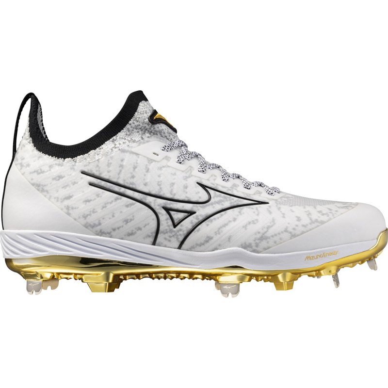 Step up your game on grass infields with the Mizuno Men's Pro Knit 2 Metal Cleats! These innovative cleats feel like an extension of your foot, thanks to the breathable knit upper that forms a natural, comfortable fit. Lightweight and agile, they're perfect for quick cuts and explosive movements. Dig in with confidence and dominate the basepaths with metal cleats that offer superior traction on grass. The Mizuno Wave® plate adds another layer of magic, absorbing shock and propelling you forward for game-changing plays. Mizuno Men's Pro Knit 2 Metal Cleats White/Gold, 8.5 - Adult Baseball at Academy Sports