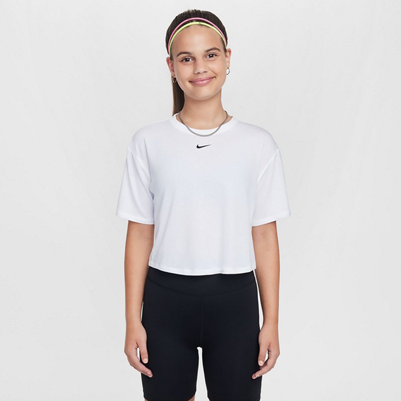 Stay dry and comfortable throughout the day with this Nike Girls' One Relaxed Dri-FIT One Loose Short Sleeve Top. It is made of 81% polyester, 13% cotton and 6% spandex for flexible comfort, and Dri-FIT technology works to wick sweat and dry quickly. Nike Girls' One Relaxed Dri-FIT One Loose Short Sleeve Top White, Large - Girl's Athletic Tops at Academy Sports
