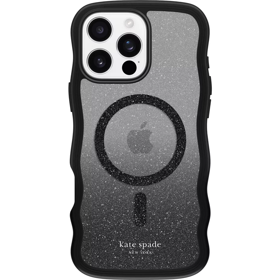 Dress up your device with the Wavy Case with MagSafe for iPhone 16 Pro Max. This unique wavy design sparkles with a black glitter ombre and smooth-touch sides. Strong, built-in magnets make it MagSafe compatible making it easy to charge your phone without removing your case. And, it shields against drops up to 10 feet for protection on the go.¹ ¹ Based on independent testing. | Kate Spade Wavy Case with MagSafe for iPhone 16 Pro Max - Nightfall | Verizon