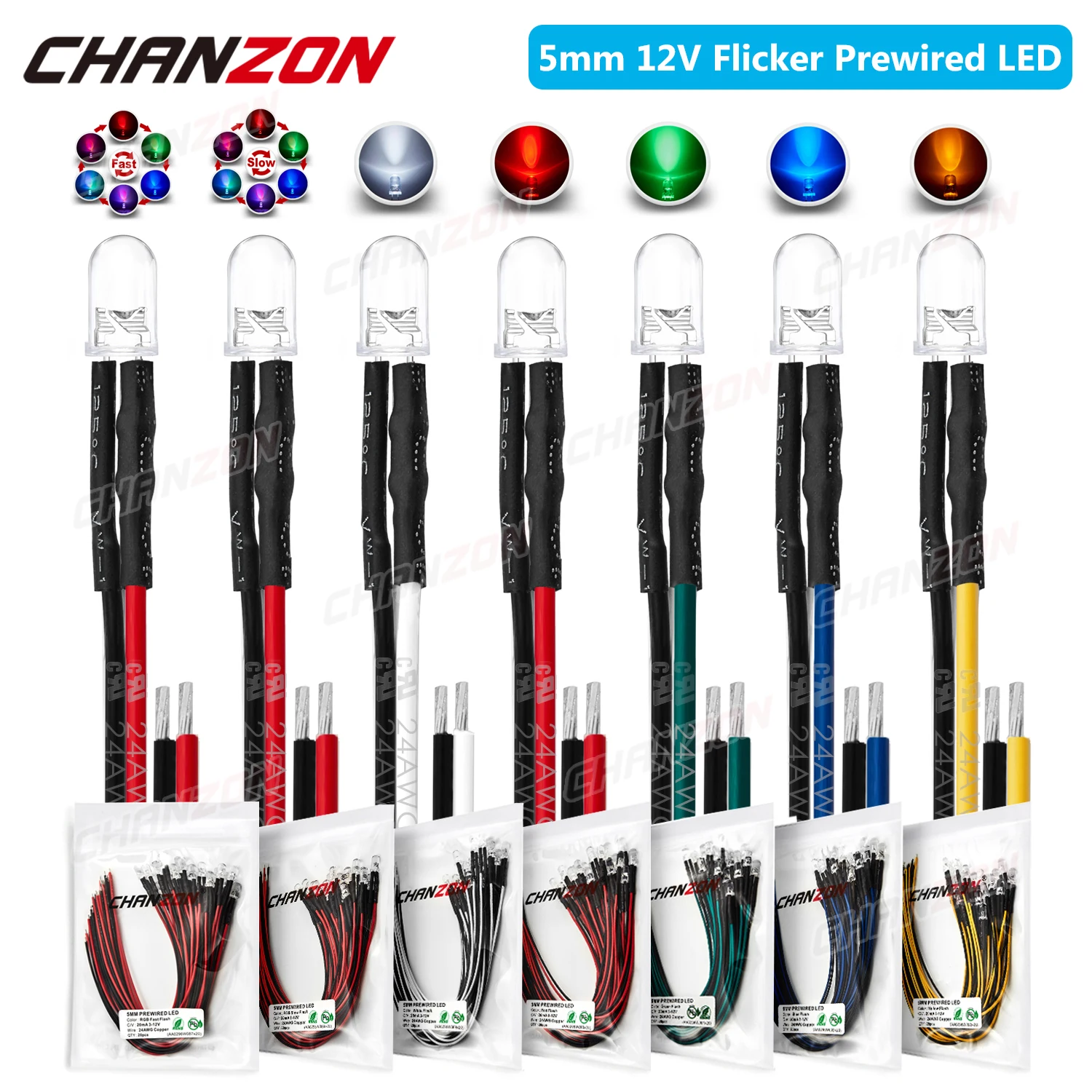 20pcs 5mm Prewired LED Light Emitting Diode DC 12V Blinking White Red Green Blue Yellow RGB Flashin…