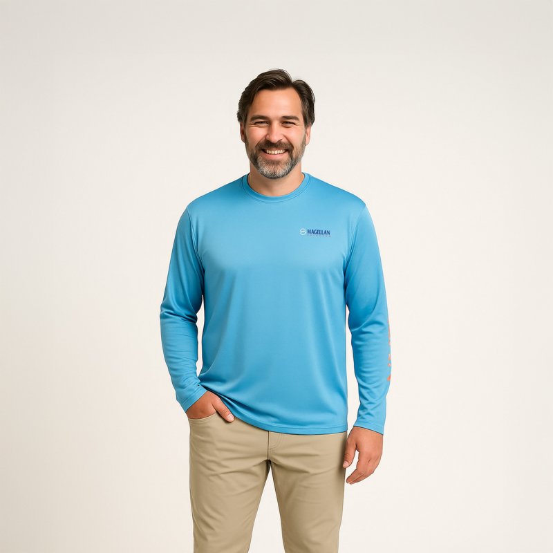 Head outside on spring days in the Magellan Outdoors Men's Casting Crew Long Sleeve T-shirt. This T-shirt is made of 100% recycled polyester interlock for durability. The UPF 50 protection helps protect against harmful sun rays. Magellan Outdoors Men's Casting Crew Long Sleeve T-Shirt Blue Aster Americana Ombre, Medium - Men's Fishing Tops at Academy Sports