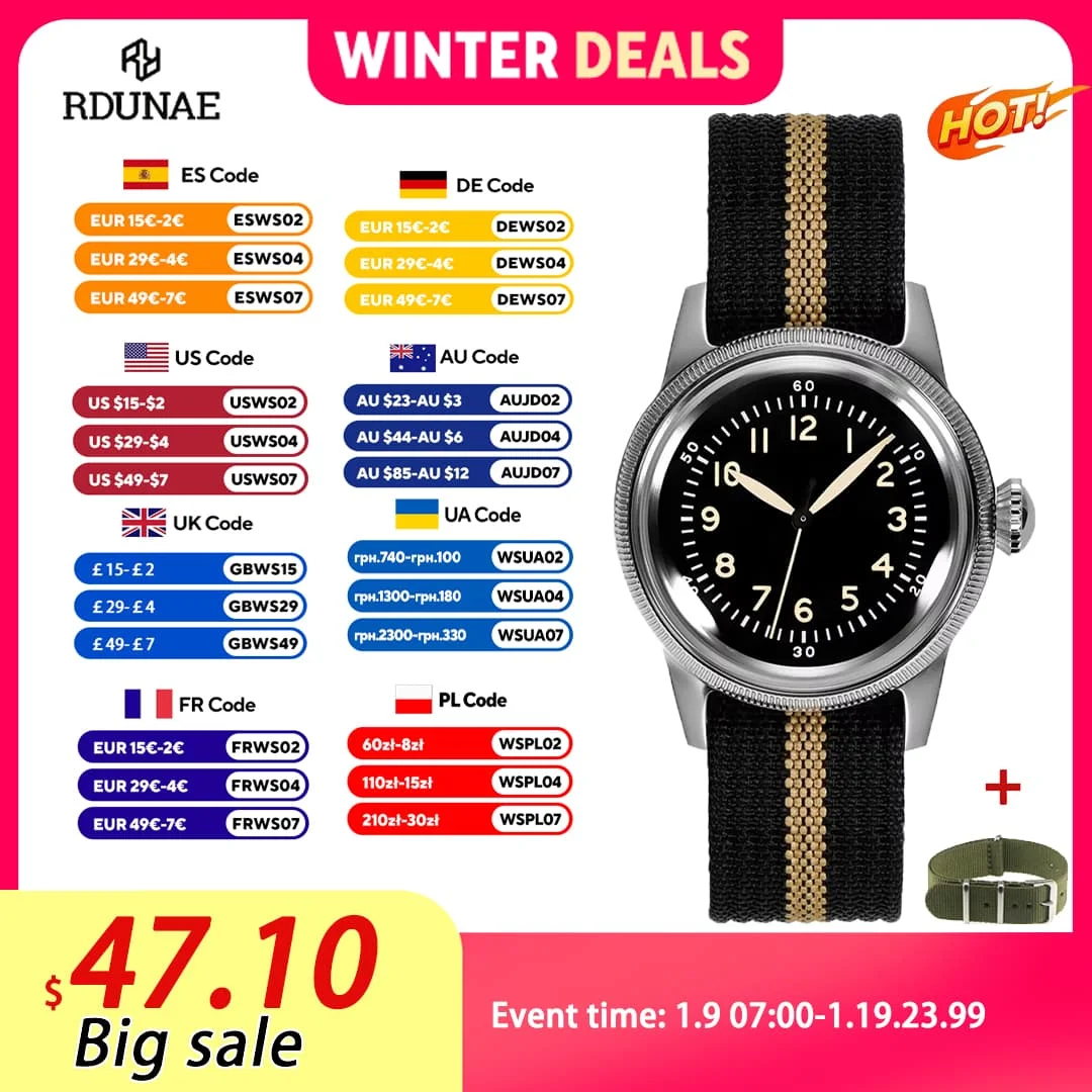RDUNAE 2025 new RA07 36mm military pilot men's quartz watch K1 mineral glass stainless steel waterp…