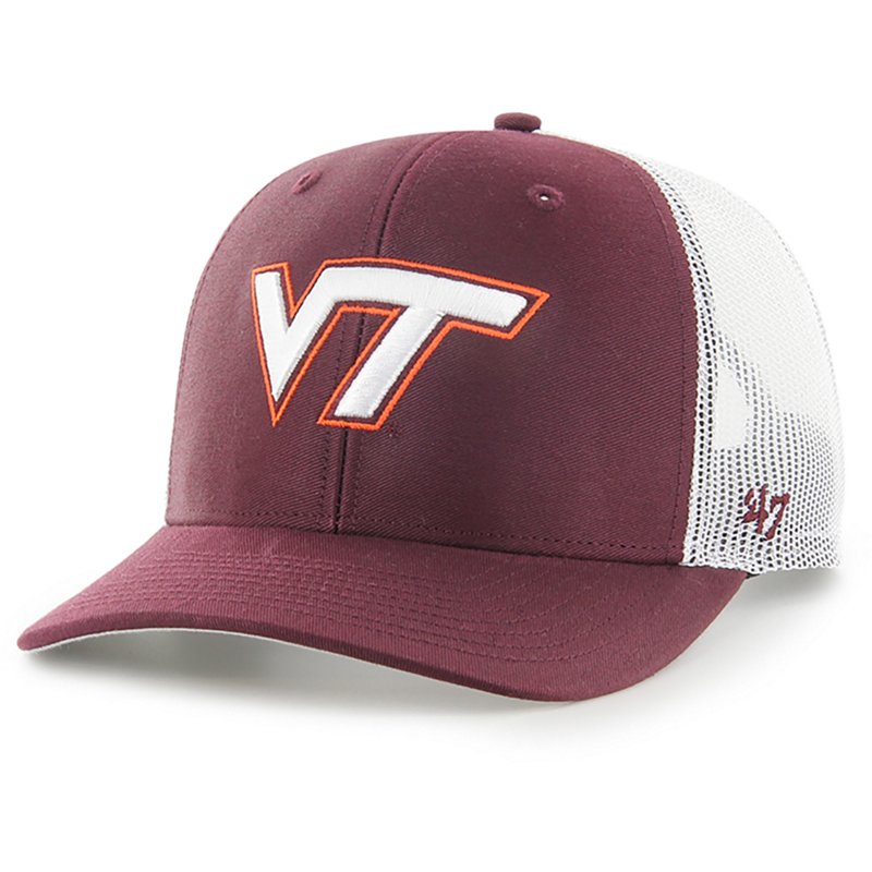 The '47 Trucker has a comfortable mid-crown, a curved visor, and an adjustable plastic snapback. The front has a raised embroidery logo. Made from garment washed cotton twill and hard mesh. '47 Virginia Tech Trucker Cap Maroon - NCAA Men's Caps at Academy Sports
